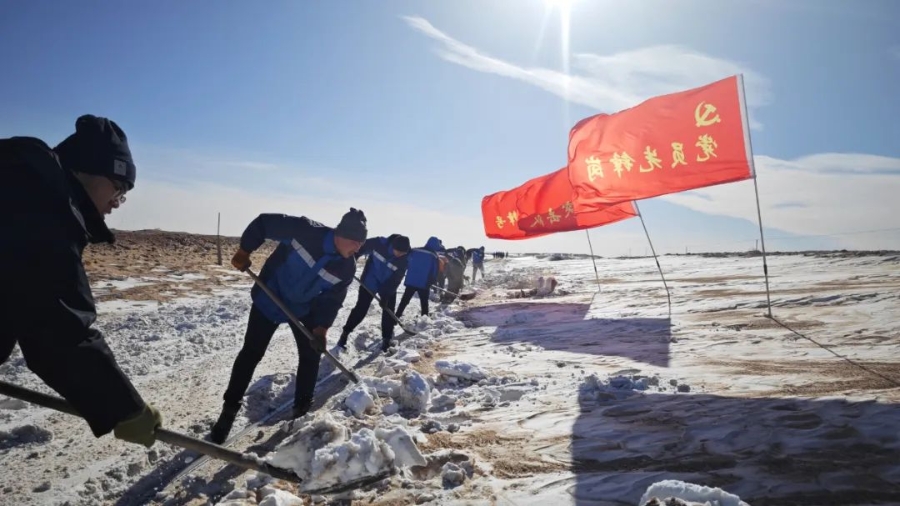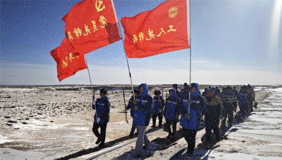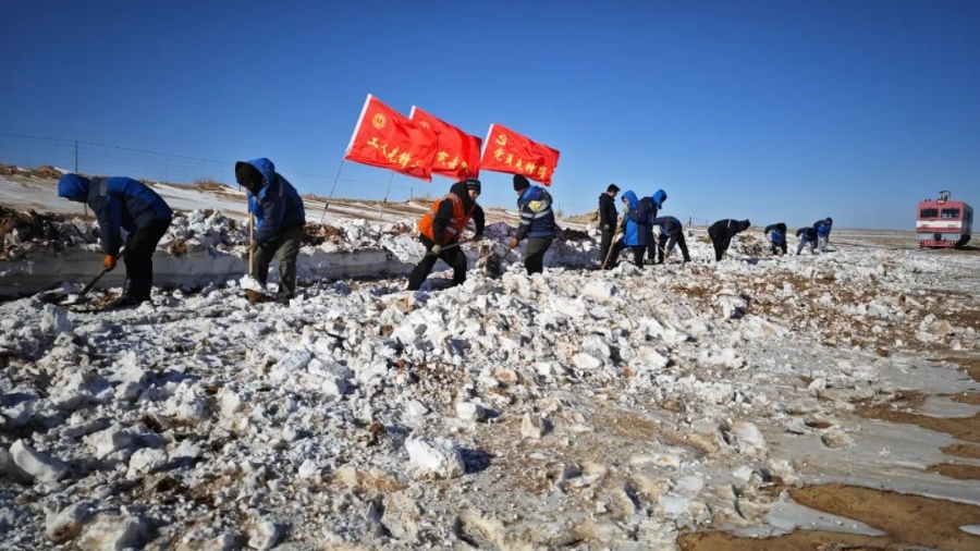 11月6-7日,郭白铁路沿线遭遇大雪并伴有风沙天气,造成线路多处掩埋,其中乌日根至郭尔奔区段掩埋最深处达50cm,严重危及运输生产安全,给郭白铁路顺利完成冬季能源保供任务带来严峻考验。以雪为令,郭白铁路迅速启动应急预案,党政工团联合行动,组织党员、团青骨干、沿线值守人员成立应急处置突击队,全线巡查线路掩埋情况。根据实际情况,划分5个应急处置分队,党员干部冲在第一线,带领队伍分区段24小时包保盯控线路状况,随时进行清理沙雪,实时保障线路畅通。党员干部职工统一指挥,统一行动,拿起铁锹,打响冬运除雪清沙作业第一枪。